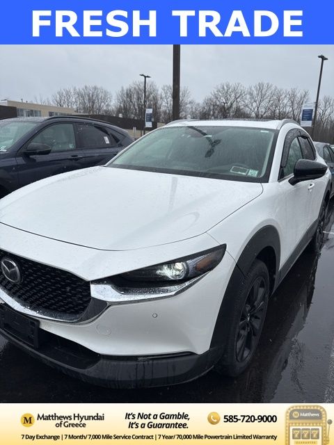Snowflake White Pearl Mica 2023 Mazda CX-30 2.5 Turbo Premium Plus Package w/Premium Plus Package AWD 6-Speed Automatic 2.5L I4 12 Speakers, 3.841 Axle Ratio, 4-Wheel Disc Brakes, ABS brakes, Air Conditioning, Alloy wheels, AM/FM radio: SiriusXM, AppLink/Apple CarPlay and Android Auto, Auto High-beam Headlights, Auto-dimming door mirrors, Auto-dimming Rear-View mirror, Automatic temperature control, Brake assist, Bumpers: body-color, Compass, Delay-off headlights, Driver door bin, Driver vanity mirror, Dual front impact airbags, Dual front side impact airbags, Electronic Stability Control, Emergency communication system: Mazda Connected Services (3-year complimentary trial included), Front anti-roll bar, Front Bucket Seats, Front Center Armrest, Front dual zone A/C, Front reading lights, Front wheel independent suspension, Fully automatic headlights, Garage door transmitter: HomeLink, Heads-Up Display, Heated door mirrors, Heated Front Bucket Seats, Heated front seats, Heated steering wheel, Illuminated entry, Knee airbag, Leather Seat Trim, Leather Shift Knob, Leather steering wheel, Low tire pressure warning, MAZDA CONNECT Infotainment System, Memory seat, Navigation system: MAZDA CONNECT, Occupant sensing airbag, Outside temperature display, Overhead airbag, Overhead console, Panic alarm, Passenger door bin, Passenger vanity mirror, Power door mirrors, Power driver seat, Power Liftgate, Power moonroof, Power steering, Power windows, Radio data system, Radio: AM/FM/HD Audio System w/Mazda Navigation, Rain sensing wipers, Rear seat center armrest, Rear side impact airbag, Rear window defroster, Rear window wiper, Remote keyless entry, Snowflake White Pearl Mica Paint, Speed control, Speed-sensing steering, Split folding rear seat, Spoiler, Steering wheel mounted audio controls, Tachometer, Telescoping steering wheel, Tilt steering wheel, Traction control, Trip computer, Turn signal indicator mirrors, Variably intermittent wipers, Wheels: 18" x 7J Aluminum Alloy.